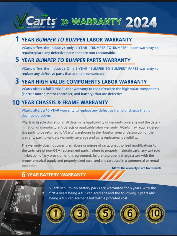 We have a wide selection of carts to choose from. All of our Vcarts are lithium powered and come with a 6- year warranty on the battery and 5-year warranty on the cart and 10-year frame and chassis!